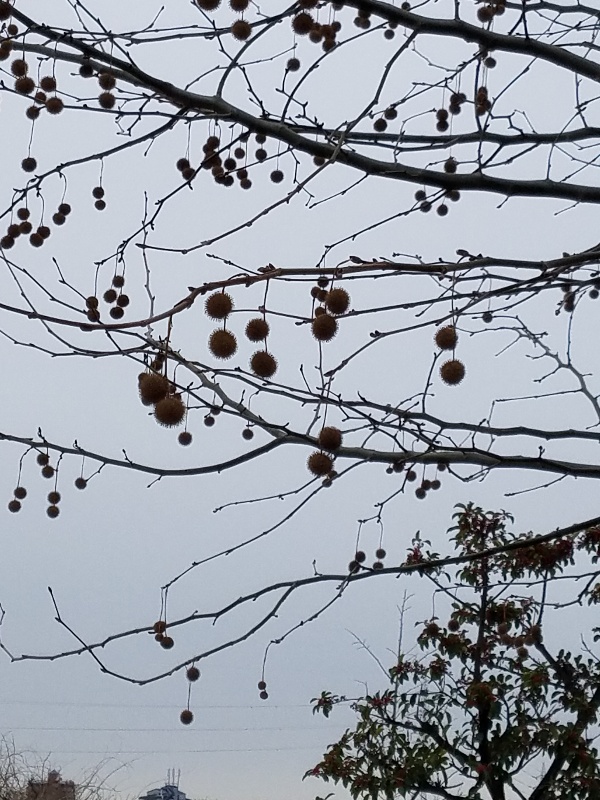 天然オーナメント 樹木 冬の季節に目立つ実。プラタナス(すずかけの木)鈴をぶら下げたような実がなる。この木は世界四代並木樹種の一つとあって、街路にあることが多いため、大抵短く切り詰められている姿を見ています。写真の様な自然樹形は珍しいと思います。 1月.16 0